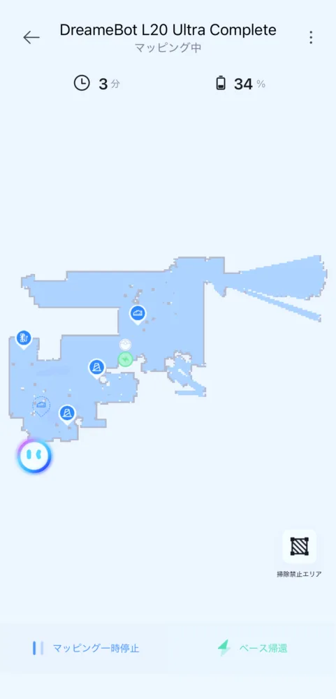 約25畳程度の広さのマッピングは5分程度で終わりみるみる内にマップが完成していきました。これは本体に内蔵されているカメラ・センサーの制度が良いことを感じます。