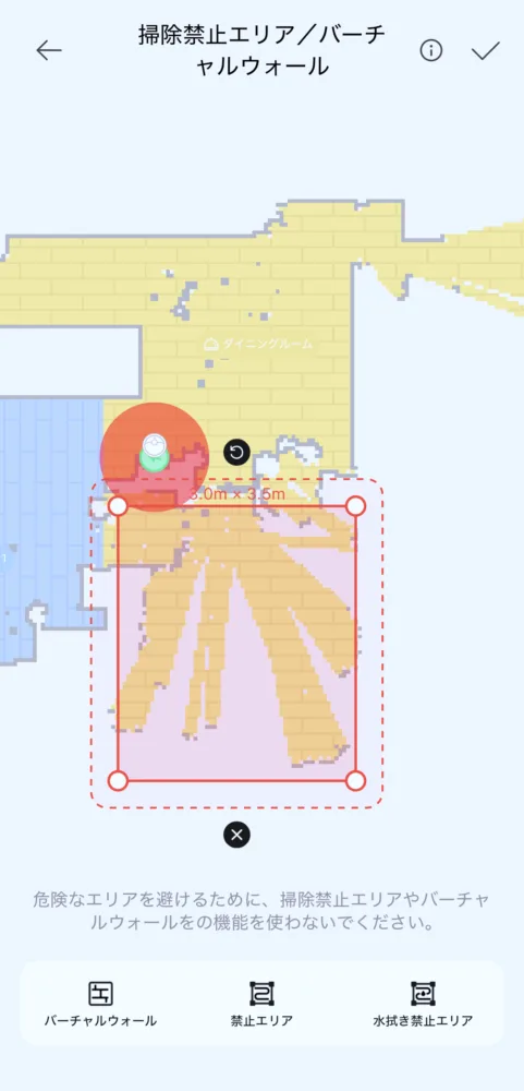 マッピングが終了するとアプリでも、以下のように電源コードや障害物がどこにあったのか確認ができます。