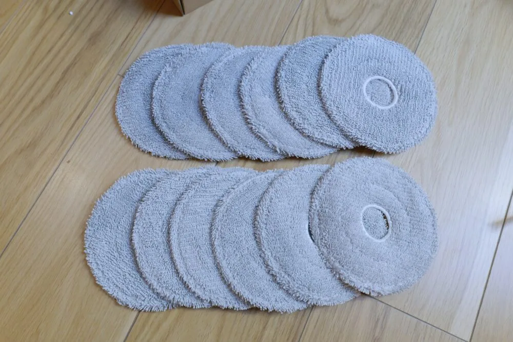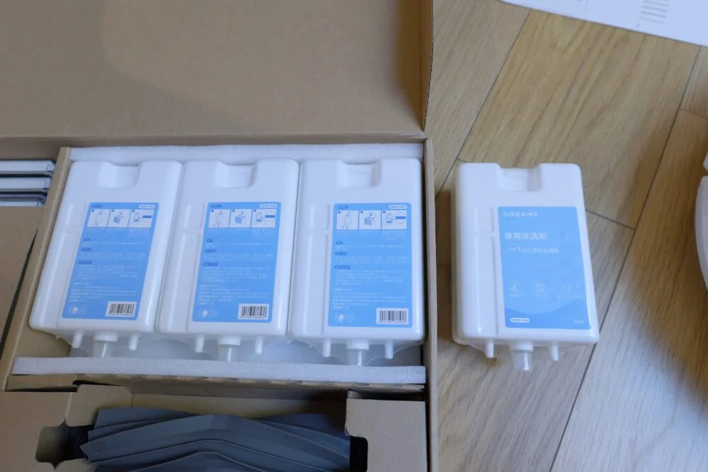 主なアクセサリーがこちらです。モップパットは12枚も入っていますし、専用床洗剤が4つも付属されていてかなり贅沢な内容になっていました。
