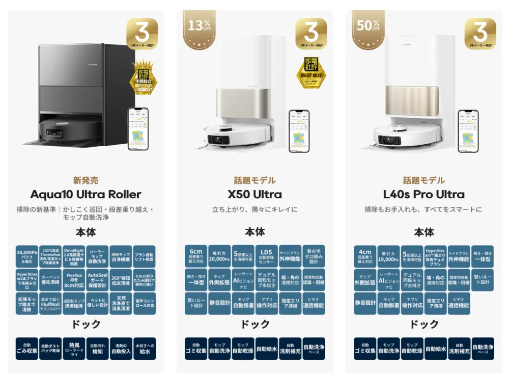 ちなみに、以下の3製品は「吸引力」「段差乗り越え」「モップ温水洗浄(除菌)」などの点で更にスペックの高い製品になっています。