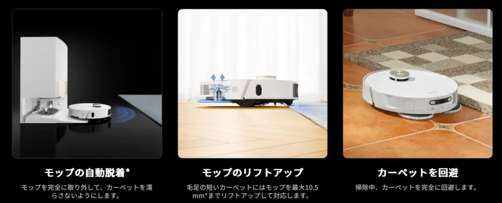 ちなみに、カーペットは「回避する」「モップのリフトアップ」「モップの自動脱着」から選ぶことができます。