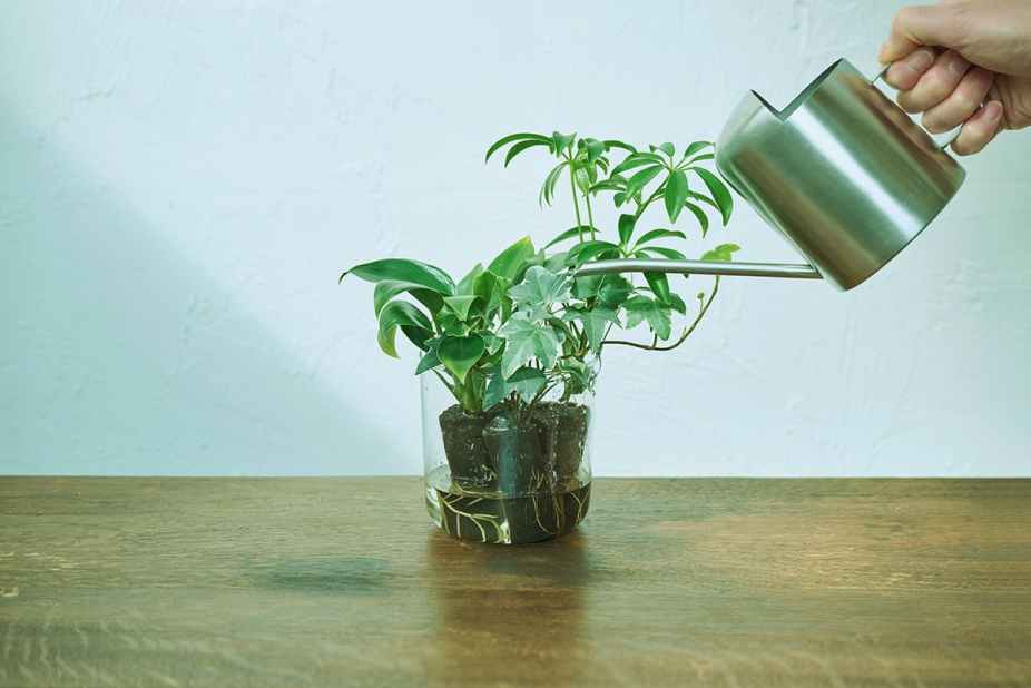 土がないから同じ器に異なる植物を入れることも、器を入れ替えることも簡単でアレンジ自在です。